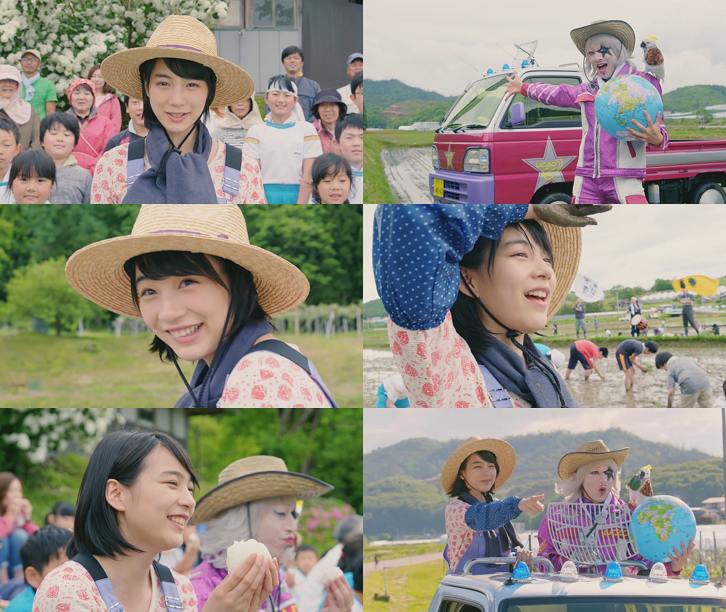 麦わら帽子をかぶった女優の、のん(能年玲奈改め)さんとゴージャスさんが、岩手の田んぼで、大勢の人と一緒に田植えをして、お昼に皆と一緒におにぎりを食べる、PV風の仕上がりの多分ウェブ限定のCMです。