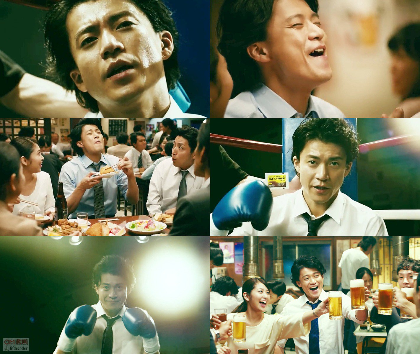 ネクタイにワイシャツ姿のサラリーマン役の小栗旬さんが、手にボクシングのグローブをはめてリングに立ち、もうフラフラで「もう、いいだろ…」とつぶやくと、後輩の女子社員から「先輩、先輩」「ここ」と胸にてをやる仕草で声をかけられ、「そうか」と、大正漢方胃腸薬を胸ポケットから取り出し「行くぜ、漢方」と気合を入れて飲み会に立ち向かう、大正漢方胃腸薬のCMです。