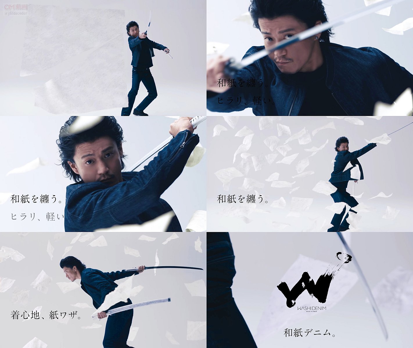 日本伝統の和紙から作られた和紙デニムを着た俳優の小栗旬さんが、「和紙を纏う。ひらり軽い」と言いながら日本刀で大きな和紙をスパッと一刀両断で斬ると、一瞬で和紙が木っ端微塵に小さく切り刻まれてひらひらと舞うスローモーション映像と共に「着心地紙技(かみわざ)和紙デニム」と言う、Right-on(ライト・オン)のCMです。