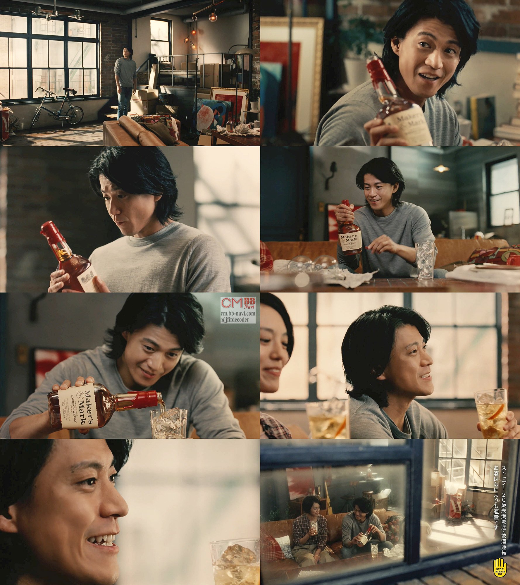 妹が住んでる部屋の引っ越しの手伝いにやってきた俳優の小栗旬さんが、メーカーズマークのクラフトバーボンを見つけ、一口飲もうとすると、妹が戻ってきて、一緒に飲んで「華やかに香る。柔らか味がする。メーカーズマーク」とつぶやくCM 改訂版です。