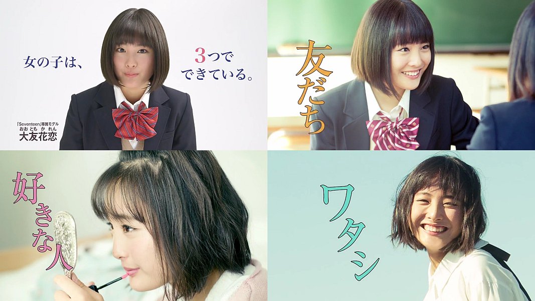 女子高生役の女優の大友花恋さんが、「女の子は3つでできている」と登場し、”友だち”,”好きな人”,”ワタシ”のショットの後で、「全部がワタシ。全部でワタシ」と語り、おすすめ少女マンガを紹介する、集英社 春の少女マンガフェア2017のCMです。