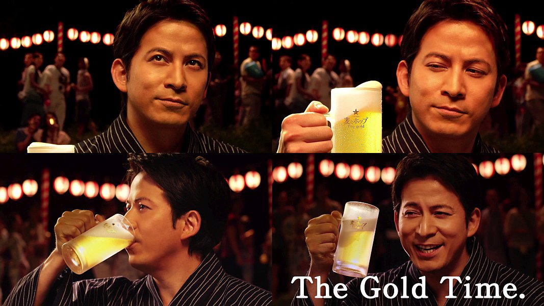 浴衣姿の俳優の岡田准一さんが、麦とホップ The Goldを注いだジョッキを手に花火大会を見ると、男性ナレーションが「夏は、夏なら、夏こそ」と言い、夜店のオヤジ役のリリーフランキーが「夏だね〜」と言い、岡田准一さんが一口飲んで「いつだって旨いよ」と言う、麦とホップ The GoldのCMです。