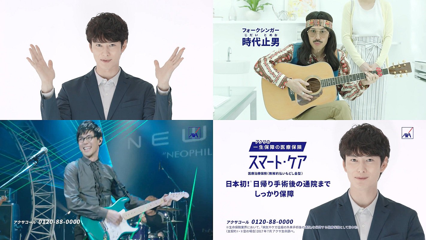 俳優の岡田将生さんが「彼の時間が動き出します」と登場し、時代遅れな70年代のサイケなファッションで古臭いギャグを言うフォークシンガーの男性 時代止男(じだいとめお)が、加入していた医療保険の説明を聞いて、人間ががらっと変わる、アクサのCMです。