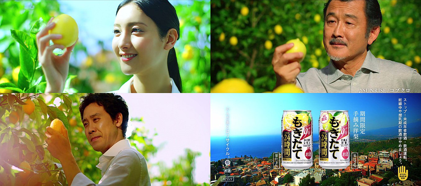 もぎたてのスタッフ役の菜々緒さん,吉田鋼太郎さん,大泉洋さんがレモン畑でもぎたてのレモンを手にしながら「このもぎたての香り」「このもぎたての味わい」「作りたかったのは、圧倒的なもぎたて感」と語る、アサヒもぎたてのCM改訂版 宮崎産日向夏。