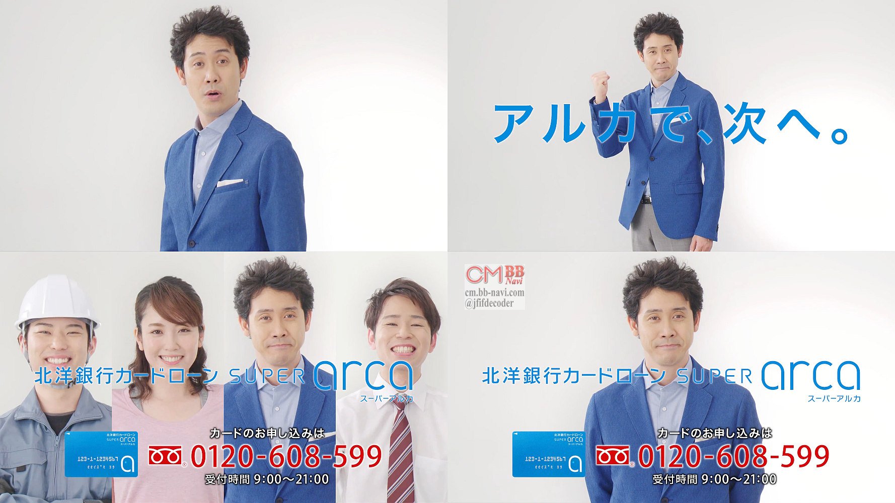 俳優の大泉洋さんが、仕事をしてるサラリーマンの男性,ヨガ教室で頑張る女性,建設現場で働く男性を見て、「頑張って毎日をおくってる皆さんをアルカは応援します」「さぁ、アルカで次へ」と言う、北洋銀行カードローン スーパーアルカのCMです。