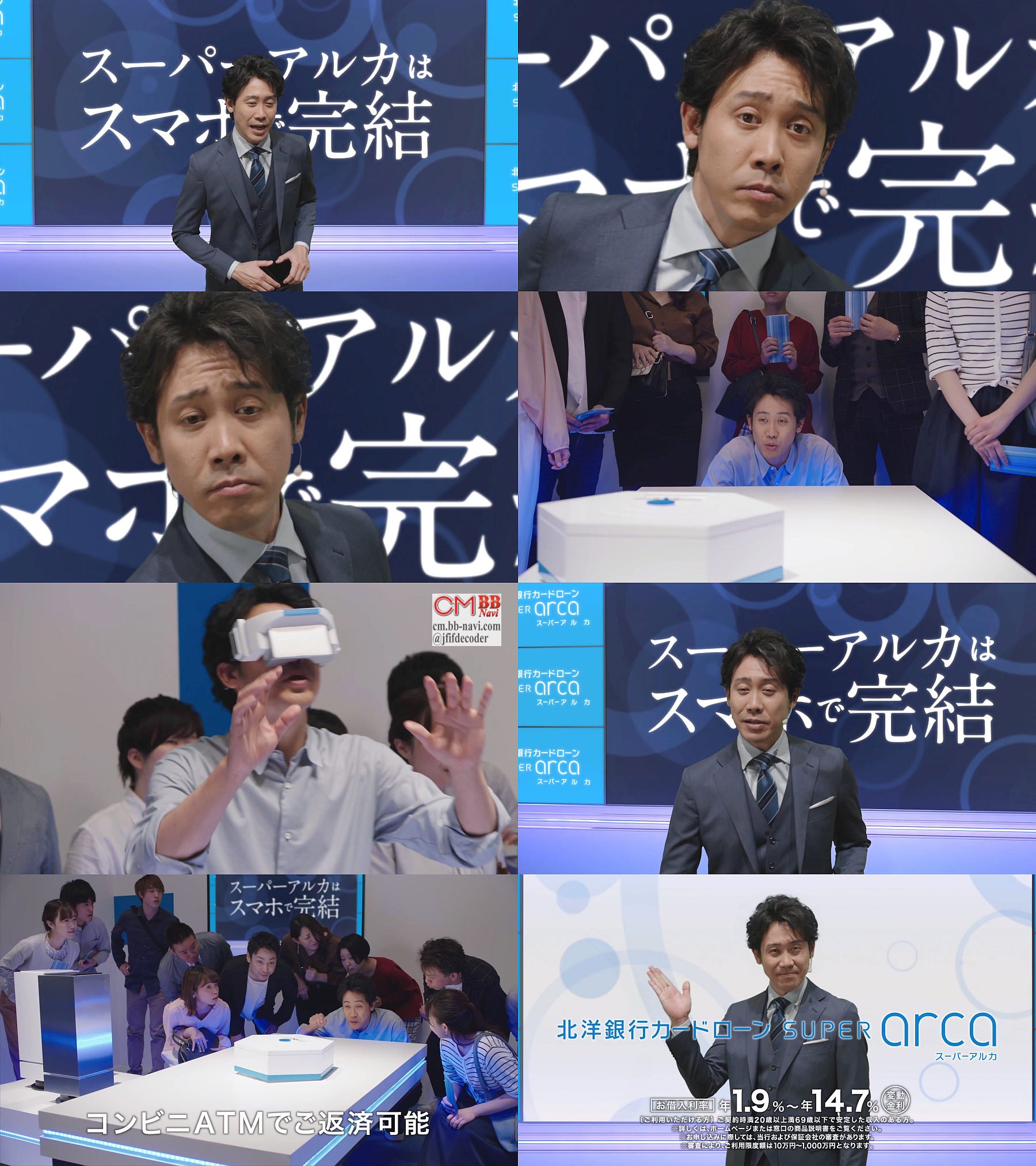 俳優の大泉洋さんが、スーツ姿で登場しスーパーアルカを紹介し「カードの申し込みはスマホで完結」と言い、「その上はコンビニATMでも返済できるのよ〜」「コンビニはこっちこっち」と自走式ロボットに合図しながら言う北洋銀行カードローン スーパーアルカのCMです。