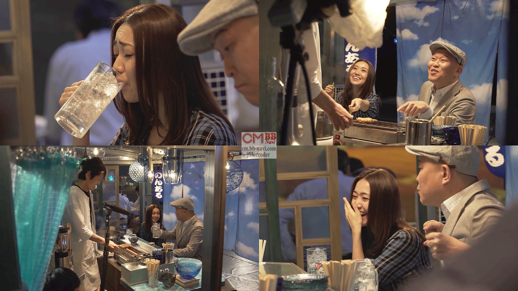 屋台で大島優子さんがノンアルチューハイを飲み「ちゃんとチューハイしてる」と言い、千原ジュニアが「ちゃんと褒めるよね」と褒める、サントリー のんある気分のCMと、メイキング動画。