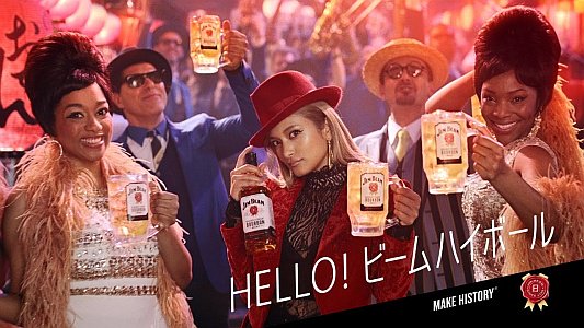 赤いジャケットを着たモデルのローラさんが、赤いハットの中からジムビームのボトルを出したり、2本に増やしたりするマジックを披露しながら、ブラスバンドと行進し、最後はコーラスのメンバーとダンスをしてジムビームのハイボールで乾杯をする、ジムビームのCMです。