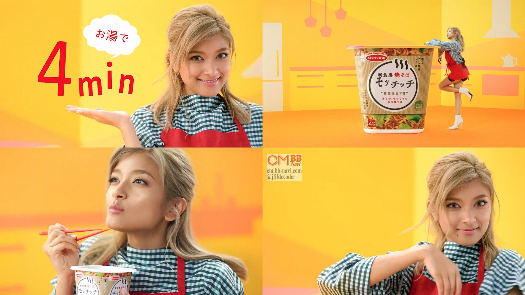 モデルのローラさんが、焼きそばのモッチッチができるまで、「モッチッチ、モチッチ、モッチッチ♪」とダンスをして、「アッチッチ、アチッチ、モッチッチ♪」と食べて「おいしい」と言う、エースコックのCM 2019年の改訂版です。