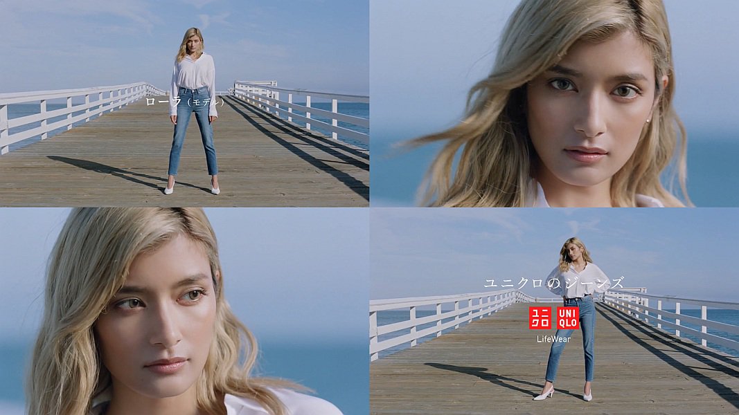 ブルーのハイライド シガレットジーンズを履いたモデルのローラさんが、海にかかる桟橋の上で「リミットは無いじゃん、何も」と人生を語り、ポージングをしながら「自分は自分で作る。だよね」「で、言い訳はしない。」「それが自分だから」と言う、ユニクロベルギーの字幕付きCMです。