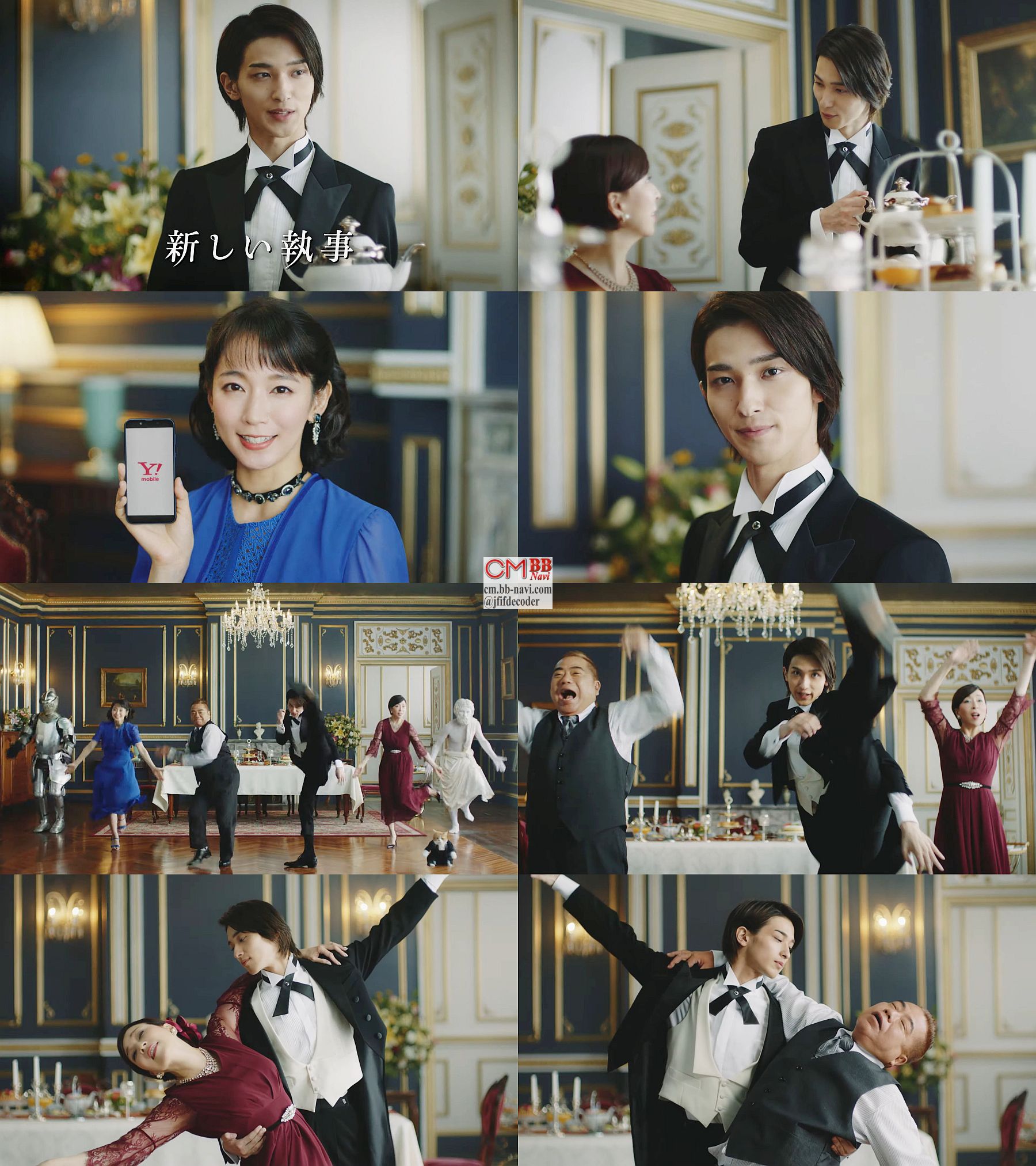 御得家の執事役に俳優の横浜流星さんが「奥様、今日もお綺麗です」「新しい執事です」と登場し、真矢ミキさんが「だって古いより、新しいほうがいいでしょ」 吉岡里帆さんが「そう、ワイモバの料金も新しくなったの」と、全員でCM曲”ジンギスカン”で「ワイワイワイモバー♪お得な新料金 凄いぞ新料金 得・得・お得感〜♪」と歌って踊って、横浜流星さんはハイキックを連続で繰り出し、女性ナレーションが『新しいイチヨンパは縛り無し』と言います。