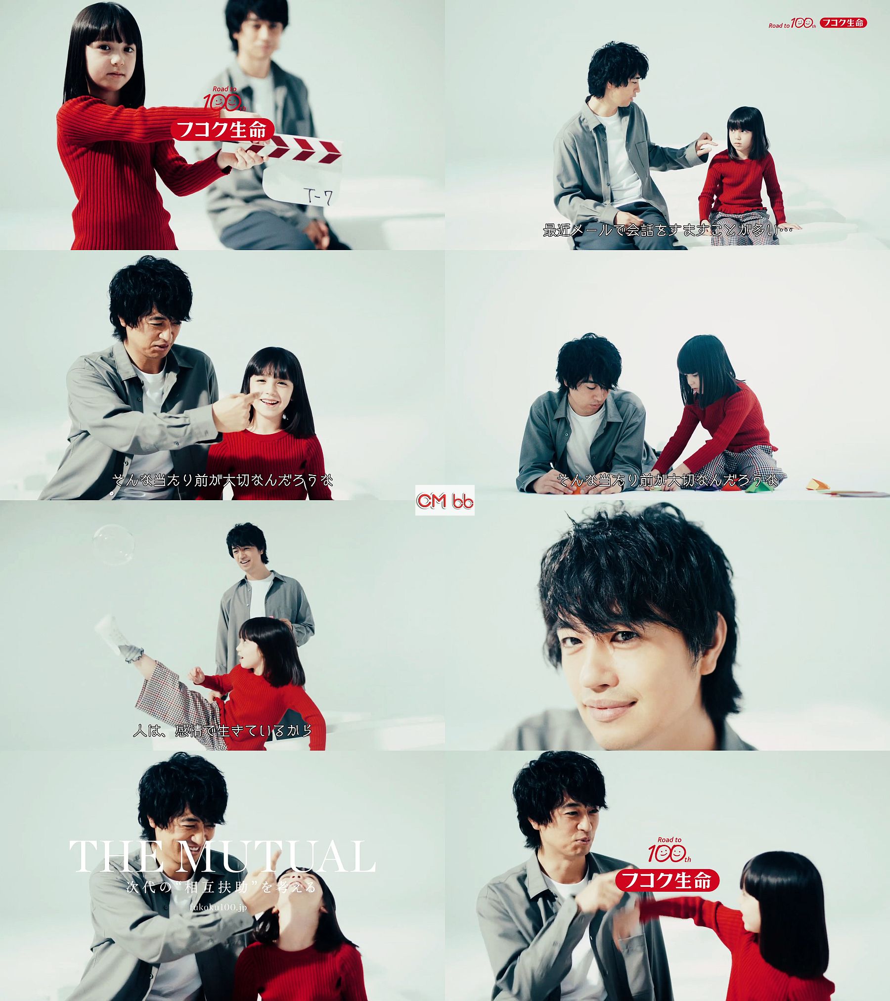 俳優の斎藤工さんが、赤いセーターの女の子と触れ合ったり、シャボン玉などで楽しそうに笑顔で子育てするように共演し「最近メールで会話を済ますことが多い」「ま、便利だけど」「感情はどこに行くんだろう」「一緒に笑う一緒に泣」「そんな当たり前が大切なんだろうな」「人は感情で生きてるから」と語り、最後に「次代の相互扶助を考える」と言います。