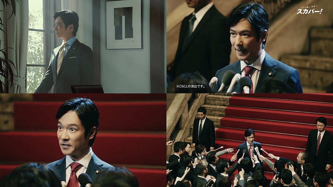 議員役の俳優の堺雅人さんが、秘書役のフリーアナウンサーの夏目三久さんに、「一体スカパーは何をやってるんだ」と聞き、報告内容を知ると、「そんな大事なこと、なぜ早く言わない」と叱責する、スカパーのWeb限定のCMです。