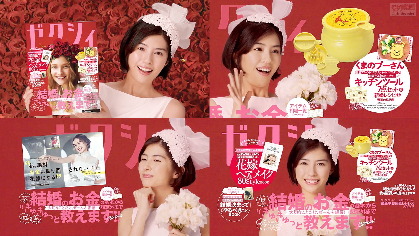 ゼクシィ10代目CMガールになった花嫁姿の女優の佐久間由衣さんが「プーさんデザイン、キッチンツール7点セット」「超絶かわいい、花嫁ヘアメイクブック」と紹介するゼクシィ 2018年1月発売号(2018年3月号) のCMです。