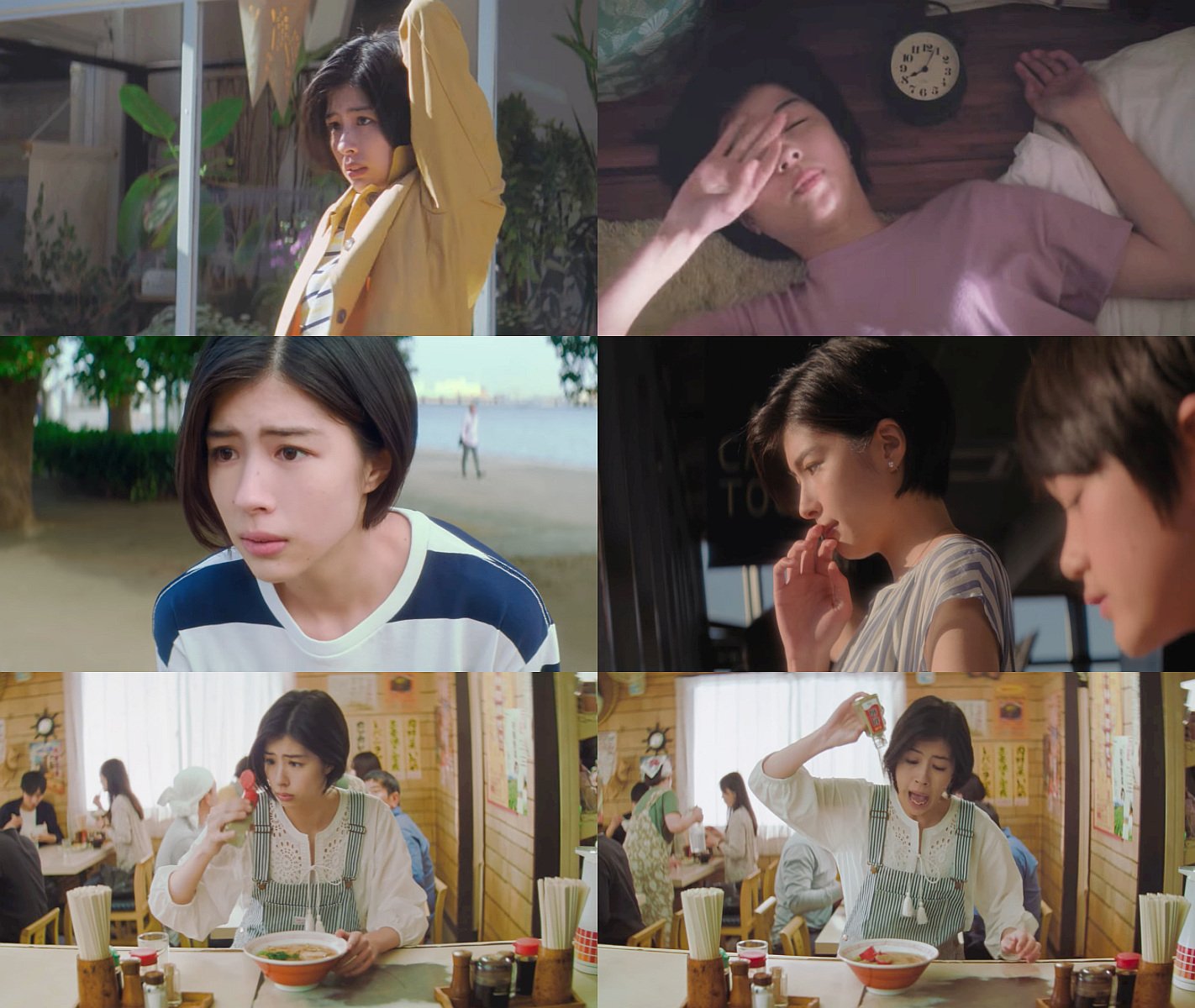 女優の佐久間由衣さんが、花屋さんのガラスに映った自分を見てポーズをしてると、ジャケットにタグがついたままだったのに気づく、coen(コーエン)のCMです。