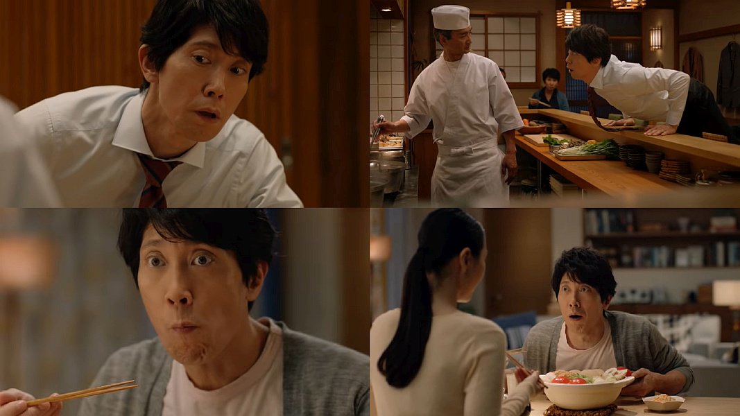 俳優の佐々木蔵之介さんが、小料理屋で「プロが使うものって気になるんだよなぁ〜」と覗き見すると「秘密です」と言われ、帰宅して妻の手料理を一口食べて「同じ味だ」と目を丸くして驚く、ミツカン 白だしのCMです。