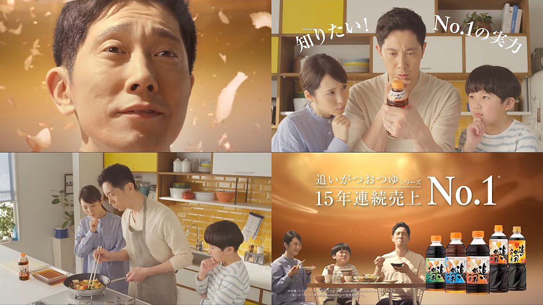 俳優の佐々木蔵之介さん一家が、追いがつおつゆをマジマジと見つめながら「ただのつゆなら、そんなに売れてる筈は無い」と、試しに炒め物を漬け込むだけで、「かつおだしの利きが違う」と感動し、至福の時を迎える、ミツカン 追いがつおつゆのCMです。