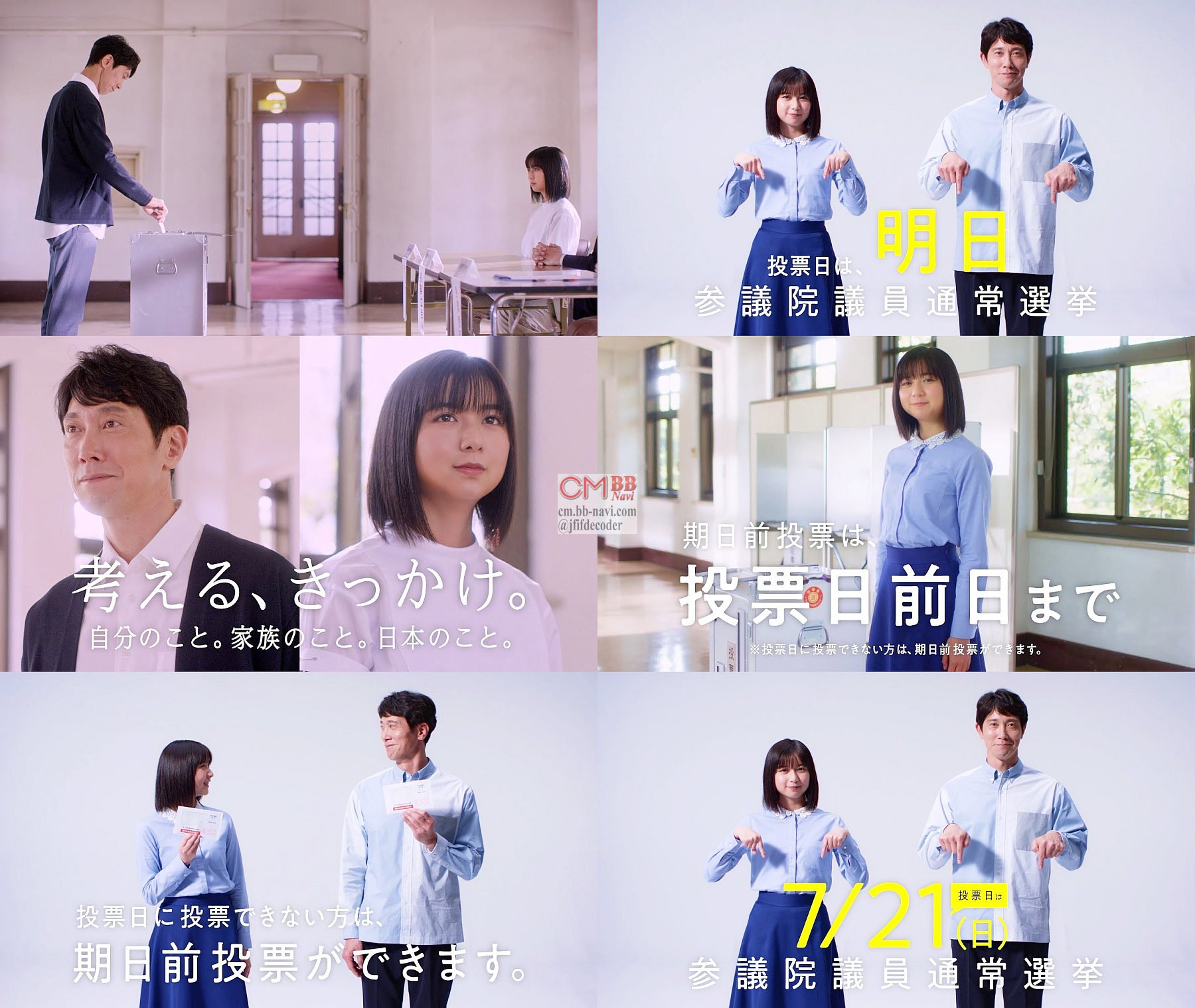 投票所の投票立会人役の女優の上白石萌歌さんが投票所の様子を紹介し、俳優の佐々木蔵之介さんが投票用紙を受け取り記入し投票箱に入れて、上白石萌歌さんが「自分のこと。家族のこと。日本のこと。考える、きっかけ。」と言う、第25回 参議院議員通常選挙の選挙啓発CM 投票日は7月21日版。