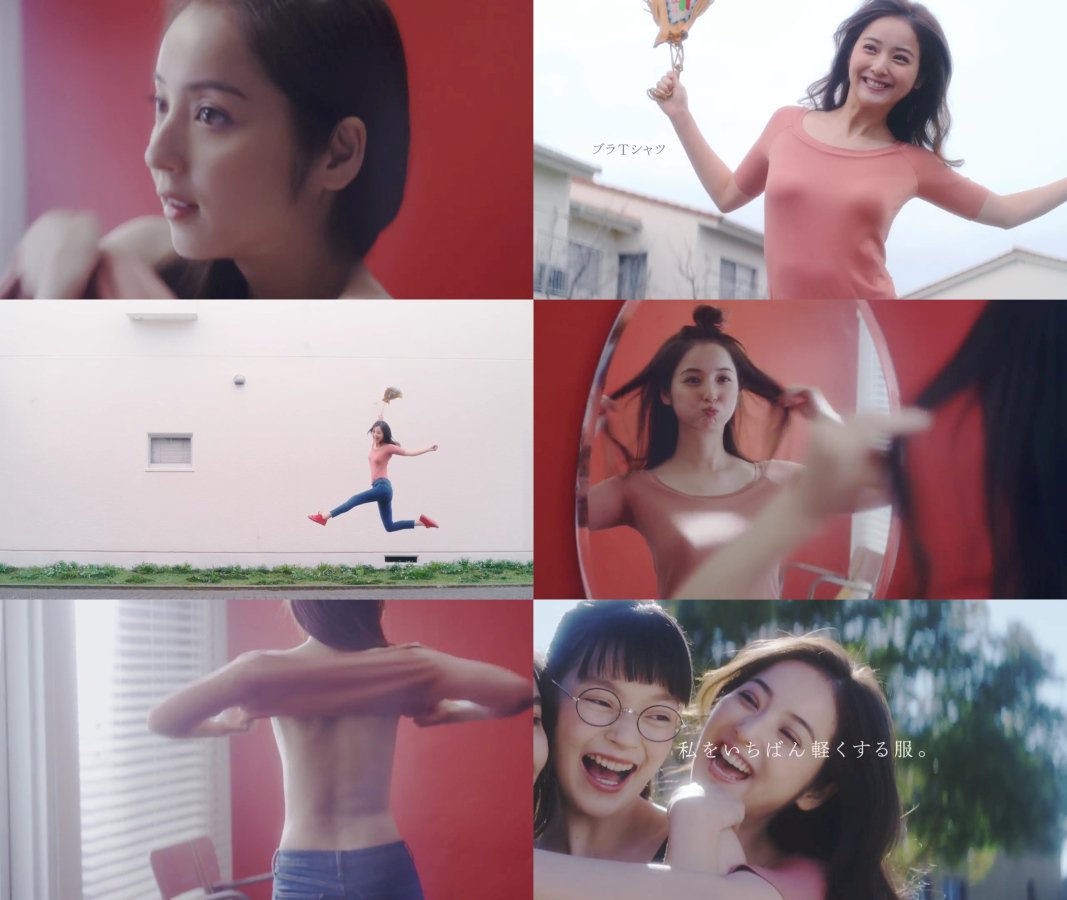 渡部建(アンジャッシュ)さんと先日結婚発表した女優の佐々木希さんが上半身裸で、後ろ向きでブラトップ(ブラTシャツ)を着用し、鏡でポージングをして、幸せ過ぎて宙を飛ぶかのように飛び跳ねながら駆けて行き、夏子さん、,ローレン・サイさんの女性モデルもブラトップを着用しポージングをし、3人が会って抱き合って佐々木希さんが「さらっと1枚で胸もコーデもキレイに決まる」