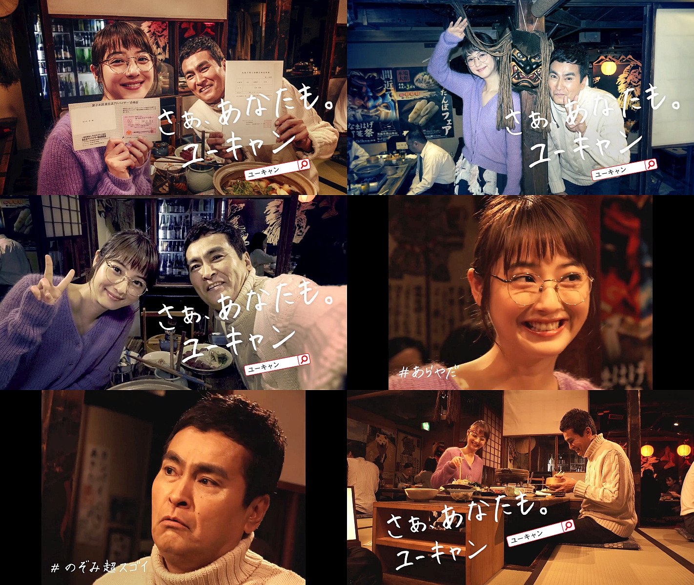 女優の佐々木希さんと俳優の石原良純さんが自撮り風ビデオカメラの映像で「食生活アドバイザーの佐々木です」「この冬疲れやすい、石原です」と登場し、佐々木希さんが石原良純さんに動物性食品をすすめ、方言(多分秋田弁)で「のぞみ超凄い」「あらやだ」と会話する、ユーキャンのCMです。