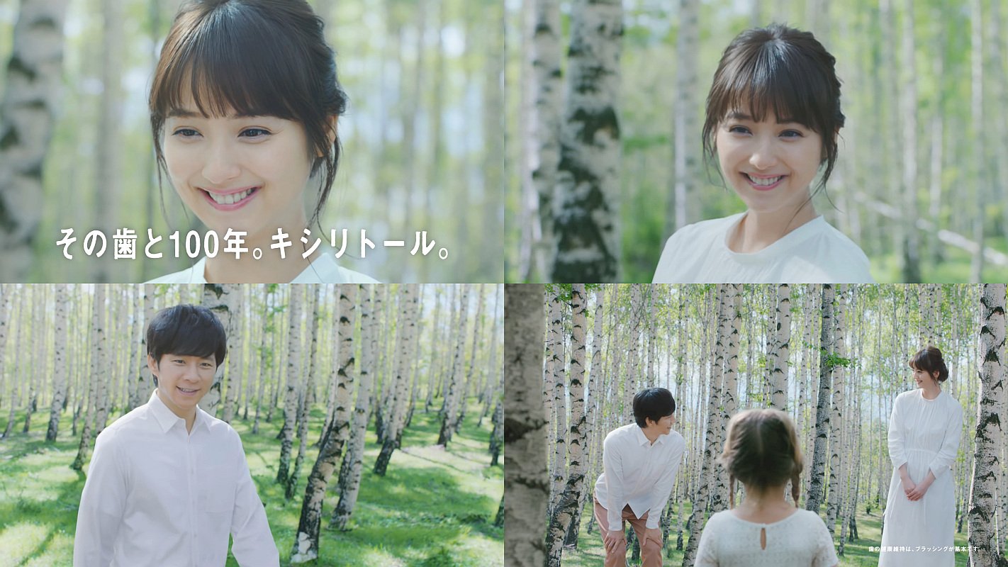 白い服を着た女優の佐々木希さんと、夫のお笑いタレント渡部建(アンジャッシュ)さんが、白樺の林を歩きながら、100歳を超えて生きる時代の為に、白樺などから作られる成分キシリトールで虫歯の原因ミュータンス菌を減らし、自分の歯で100年をと提案する、ロッテ キシリトールのCMです。