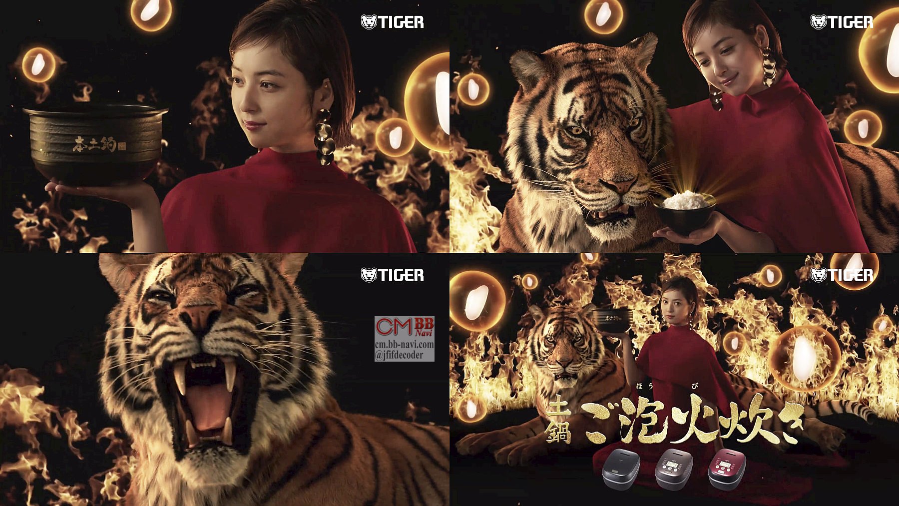 「タイガー土鍋ご泡火炊き♪」のCM曲と共に赤い服を着た女優の佐々木希さんが3DCGの虎と燃える炎と共に登場し「踊るだけじゃ米は傷つく」「土鍋の効果力と泡で甘みを守る」と語る、タイガー魔法瓶 炊きたて 土鍋ご泡火炊きのCMです。