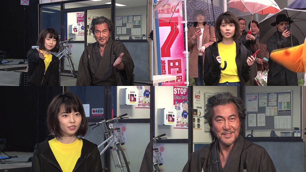 タイムスリップして現代にやってきた侍役の俳優の役所広司さんが宝塚歌劇団の紅ゆずる さんに一目ぼれし、島崎遥香さんが絡む宝くじのCMのメイキング動画です。