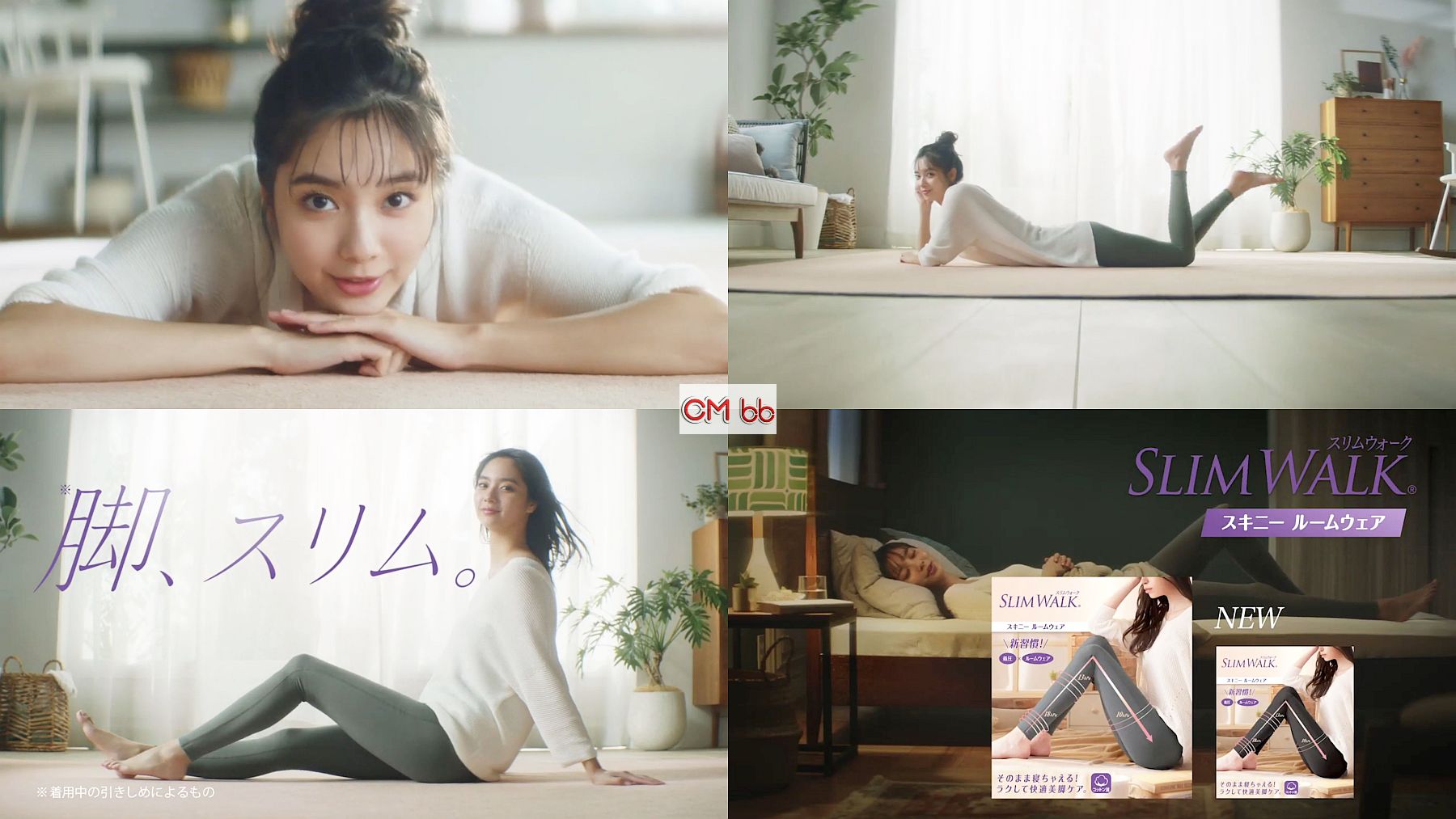 新川優愛さんが「着圧ソックスって面倒くさそう?」と問いかけ、スキニールームウェアでベッドに横になり「そのまま寝れるよ」という、スリムウォークのCM。