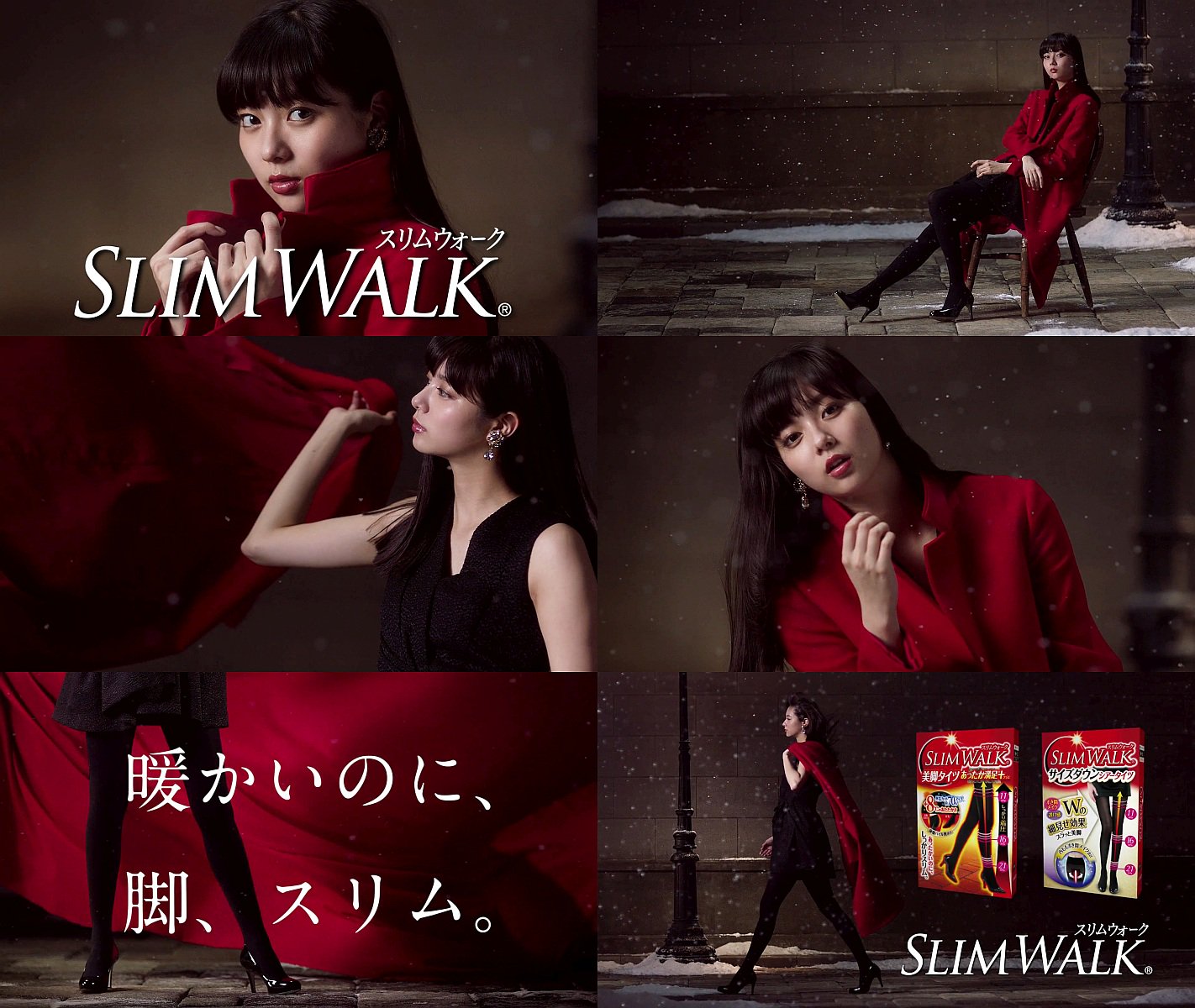 真っ赤なコートに真っ黒なタイツを履いた女優の新川優愛さんが、雪の降る街角の雪道で「見せるところは細く」「見せないところは暖かく」「暖かいのに、脚、スリム」「あったか美脚タイツ」と、ポージングとウォーキングをするスローモーション映像を使った、スリムウォークのCMです。