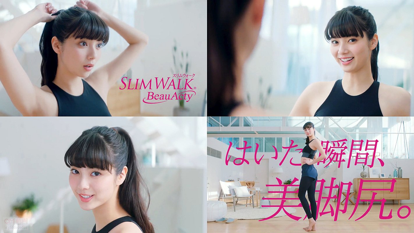 女優の新川優愛さんが、スリムウォーク Beau-Acty(ビューアクティ)をはいて、鏡の前でつま先立ちでポージングをし、「美脚、美脚、美脚からの… 美脚尻」「はいた瞬間、美脚尻」とポージングをして、ジョギングに出て行くCMです。