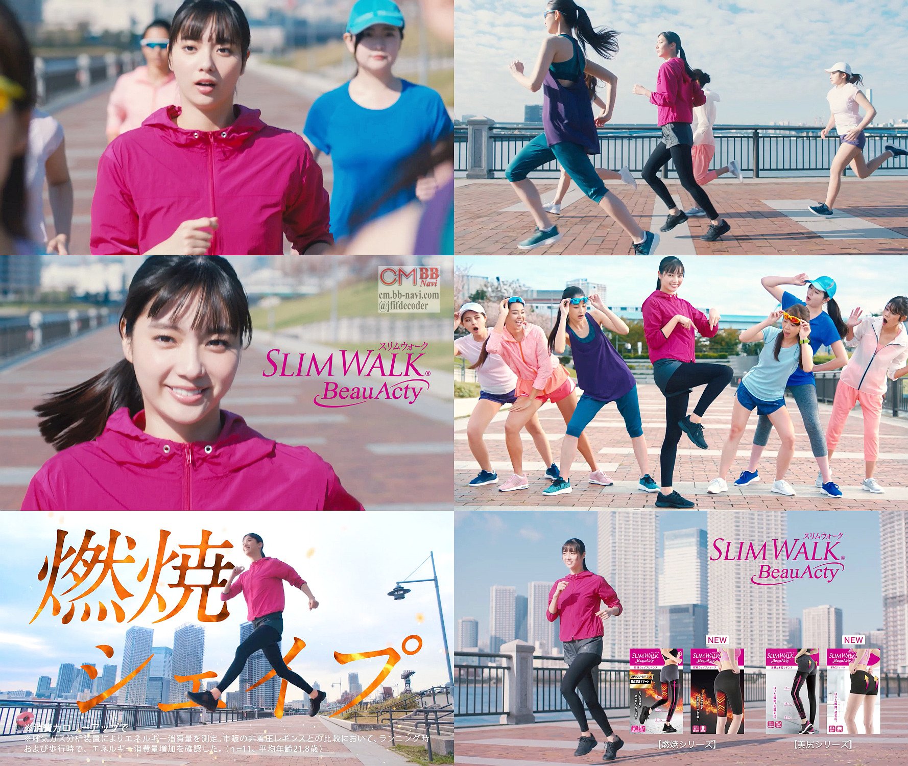 「スリムウォーク ビューアクティー」と登場しジョギングをする女優の新川優愛さんが、「痩せたいけど、ハードな運動はちょっと…」と言って振り向いて「な私は、これ」とポーズして、燃焼シェイプレギンス姿で「効率的に燃焼シェイプ」とジャンプし「スリムウォーク 燃焼シェイプレギンス。ショーツも」と言うCM 2019年8月改訂版です。