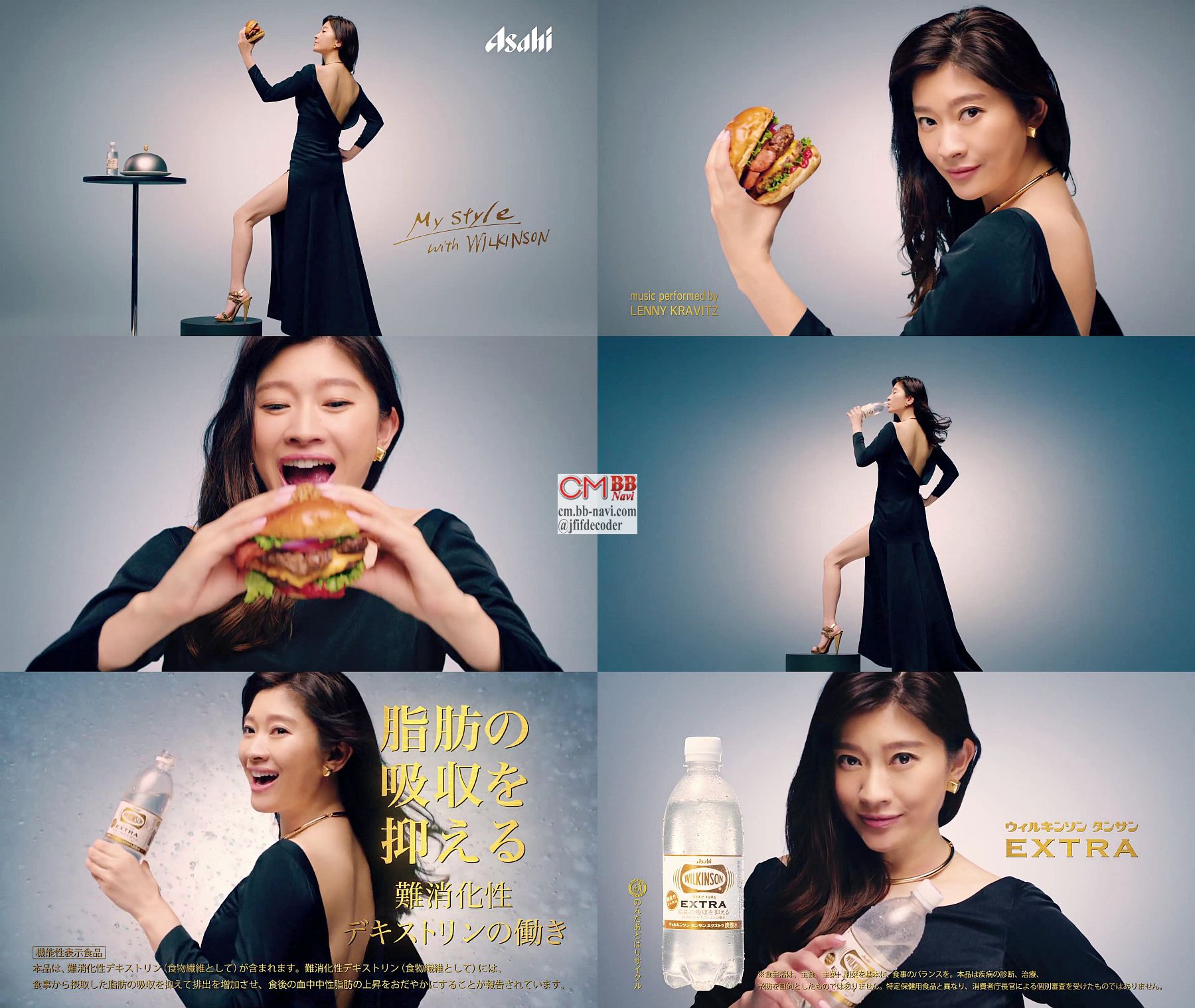 背中が大きく開いたドレスを着た女優の篠原涼子さんが、スリットから引き締まったひとももを出して、「行きます」と手に持った巨大なハンバーガーにかぶりつき、爽やかな表情でウィルキンソン炭酸を飲み、「脂肪の吸収を抑える炭酸水」「ウィルキンソン タンサン エクストラ」と語ります。