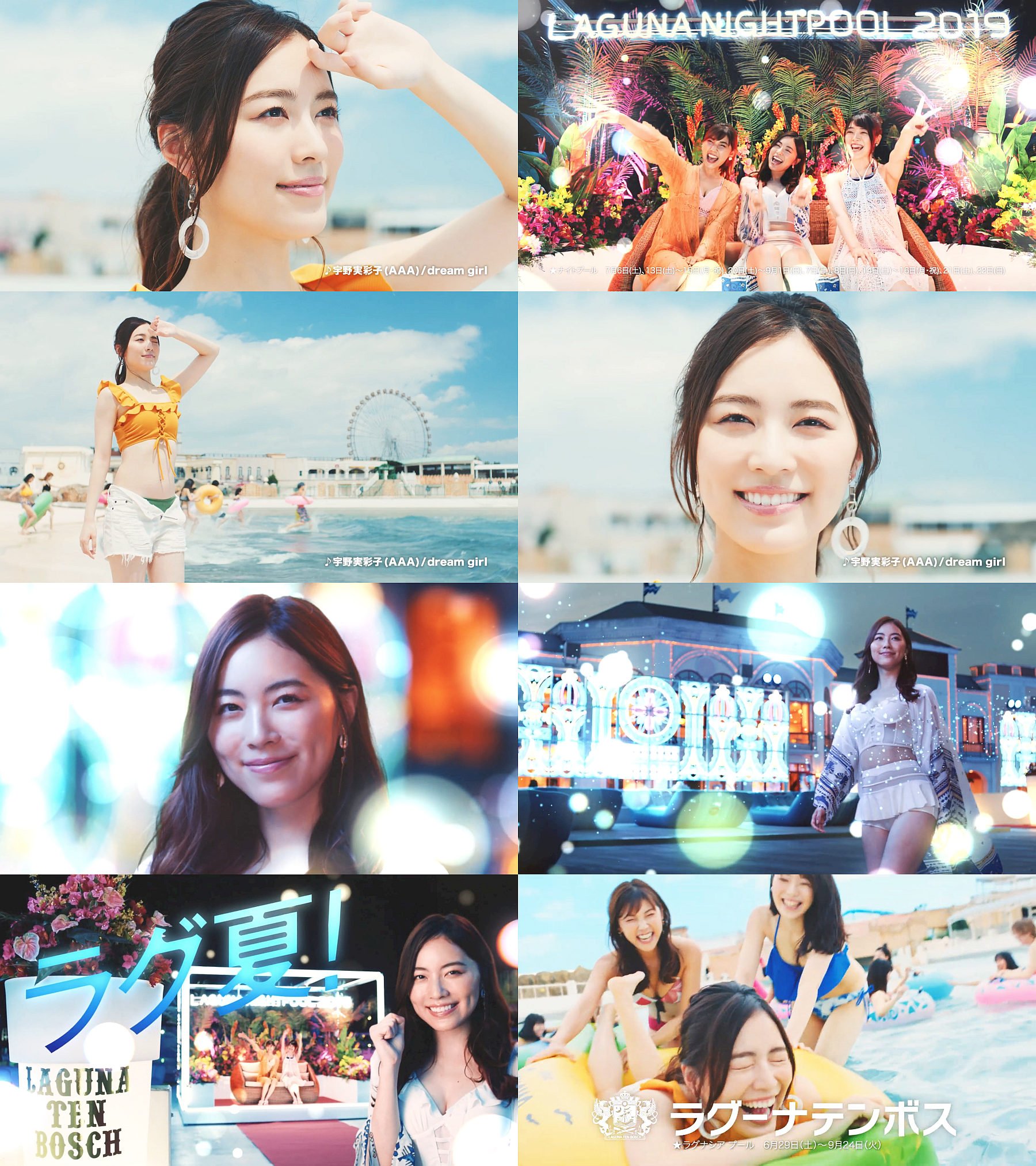 松井珠理奈さんがおへそを出した水着姿で「昼も」「夜も」 「暑いぜ、ラグ夏」と言うラグーナテンボスのCM。
