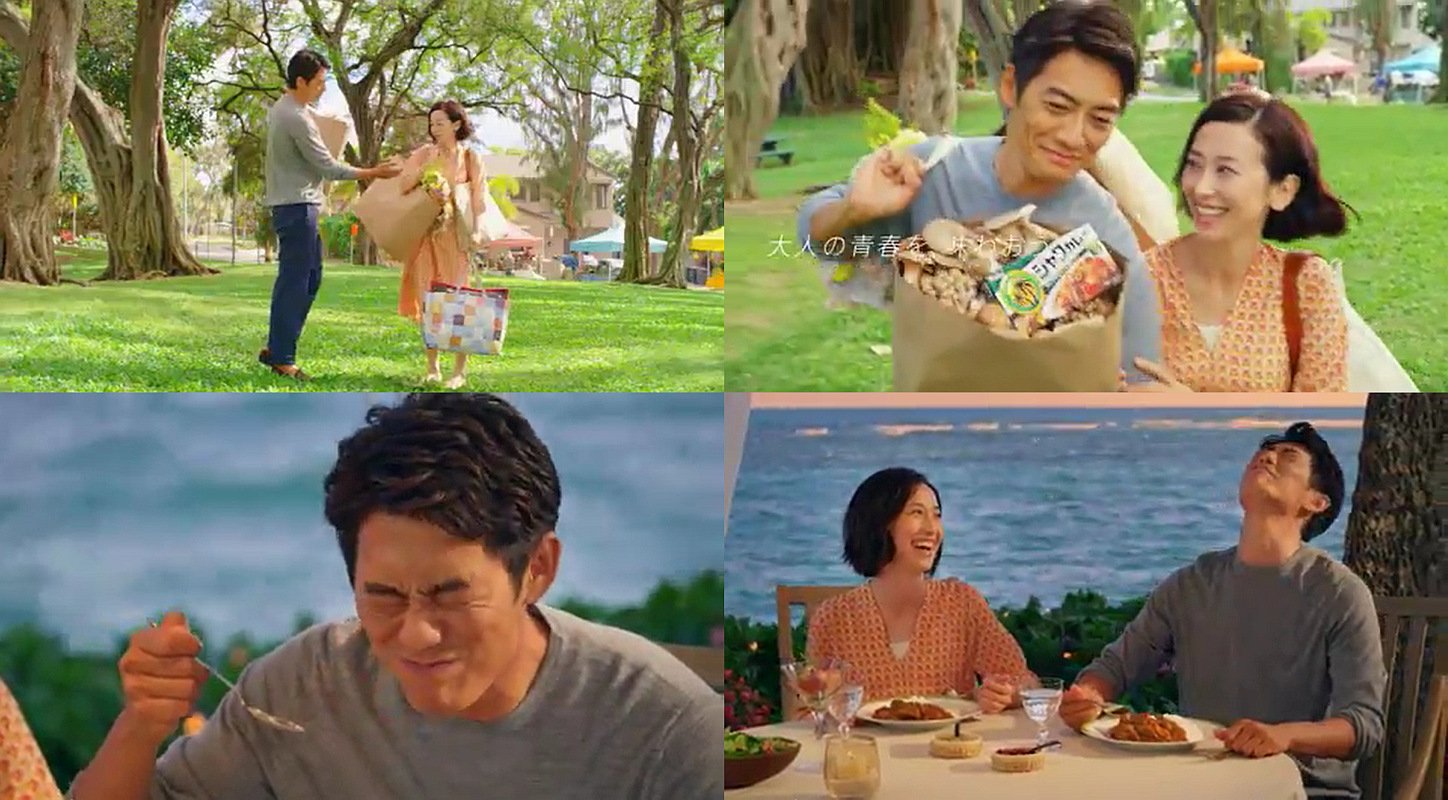夫役の俳優の反町隆史さんが、妻役の女優の紺野まひるさんの買い物の荷物を持つのを手伝って、帰宅し、海が見える庭でジャワカレーを食べる、CMです。