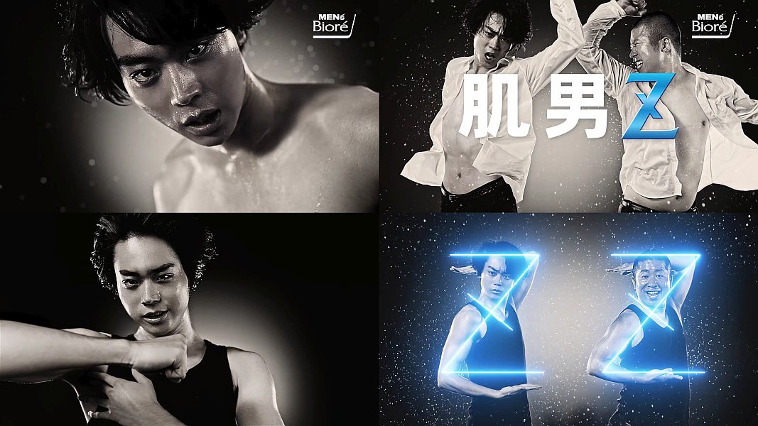 俳優の菅田将暉さんと澤部佑さんの二人が、白いシャツがびしゃびしゃになるほど沢山汗かいても、臭いわせない男、肌男Zになって、二人揃ってZの形のポージングをする、花王メンズビオレ肌男ZのCMです。