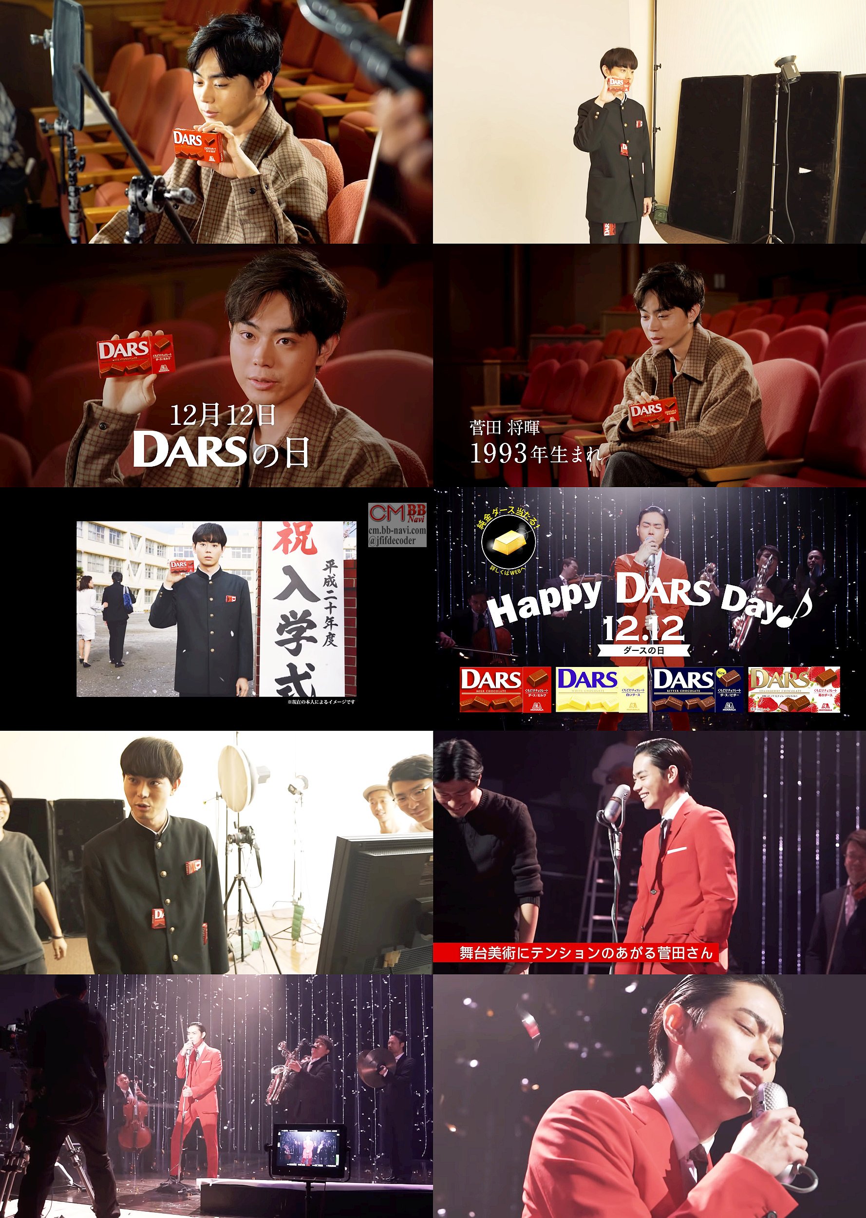 俳優の菅田将暉さんが、劇場の椅子に腰かけてインタビューを受けながら「同じ年に生まれて、名前も少し似てて」と、1993年生まれで、”スダ ダース”のテロップが表示され、「なんかずっと一緒にいた気がしますね」と語り、赤ちゃんのメリーのかざりがダースや小学校の運動会のバトンがダースで、高校入学式の時に片手にダースの写真が映り、「もう25年かぁ、そんな節目に歌います」と語り、「ハッピーダースデートゥーユー♪」と歌う、森永ダースのCM 字幕付きバージョンです。