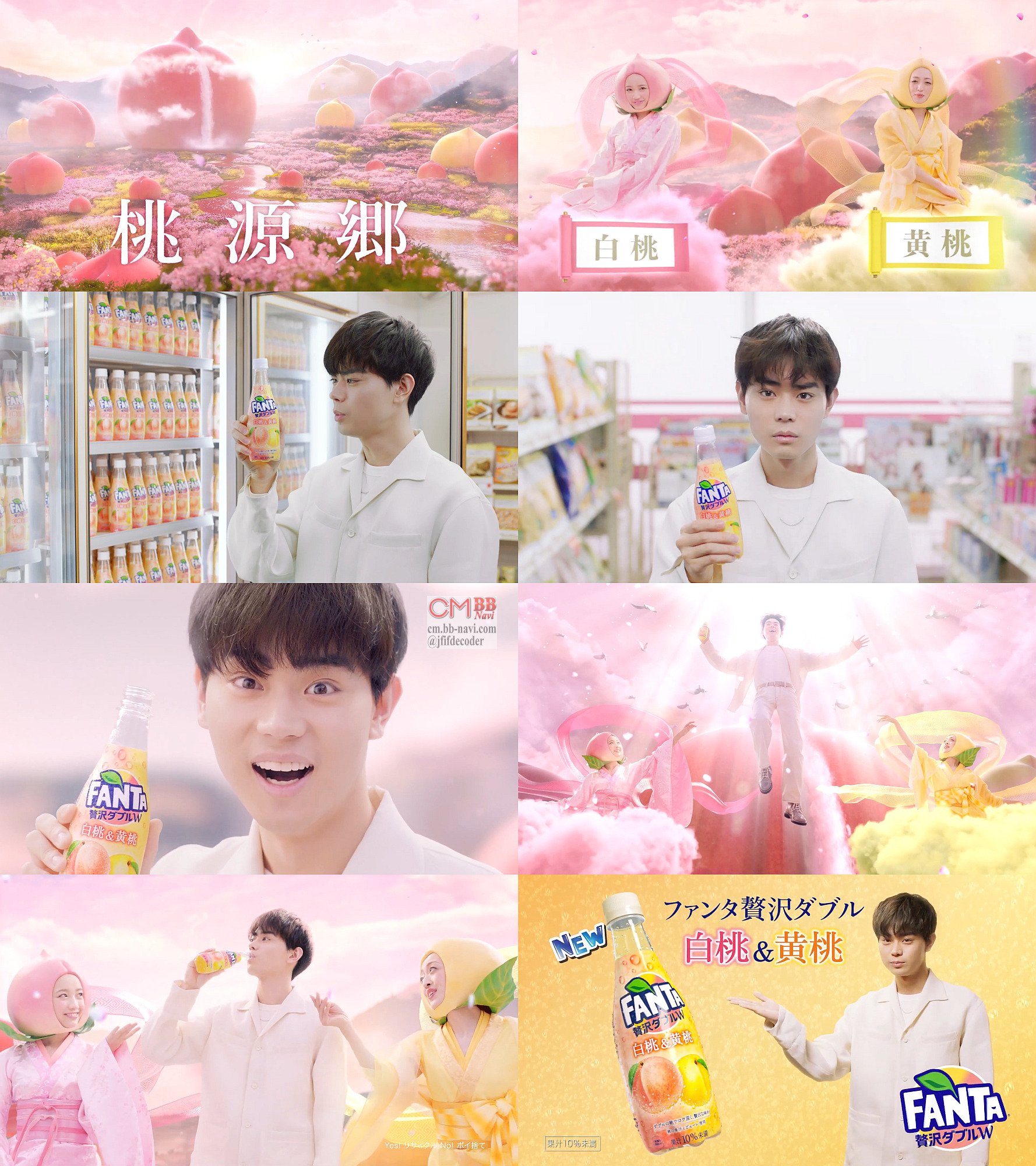 俳優の菅田将暉さんがコンビニで新しいファンタ 贅沢ダブル 白桃&黄桃を見つけ、「ダブルのピーチ?」と見つめると、目の前に「そこは果てしない桃の世界だった」と桃だけでできた桃源郷が現れ、白桃の美女(LARME DOLLSの白川怜奈さん)と黄桃の美女が「上品な桃、濃厚な桃、どっちもどうぞ」と登場し、菅田将暉が一口飲むと宙にふわりと舞い上がり「ダブルで贅沢だぁ」と言います。