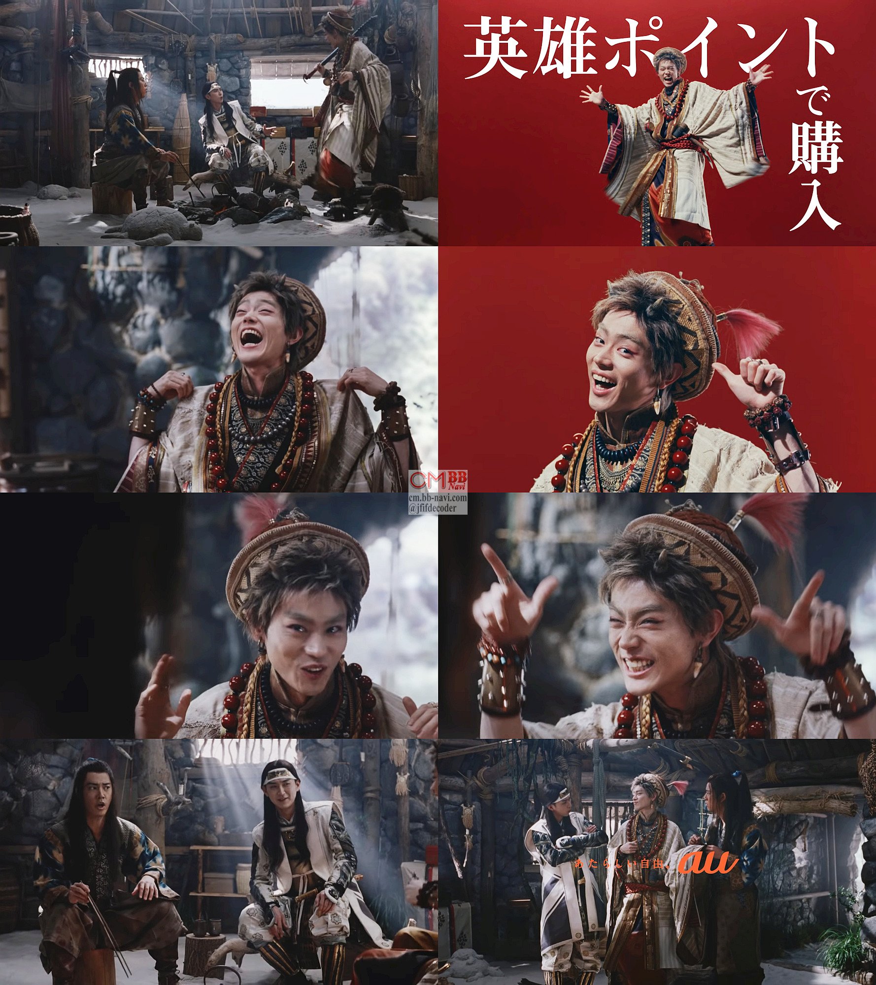 鬼ちゃん役の俳優の菅田将暉さんが、桐谷健太さんと松田翔太さんがいる浦ちゃんの家に「なんか今日オシャレ」なコーデでやってきて、英雄たちが貰えるポイントの、au ポイントで買ったと言って「鬼ちゃん英雄?」「て鬼でしょ」「そこ、ツッコミポイントっすね(笑)」と笑いし、おしゃれポイントは、「ワンポイントの帽子がさりげなポイントでおしゃれポイントっす」とポイントが多いと突っ込まれ、「ポイントの鬼っす(笑)」とキメ顔でポーズし、最後は服の破れを指摘され「ダメージ加工っす。お気に入りポイントっす」と答えます。