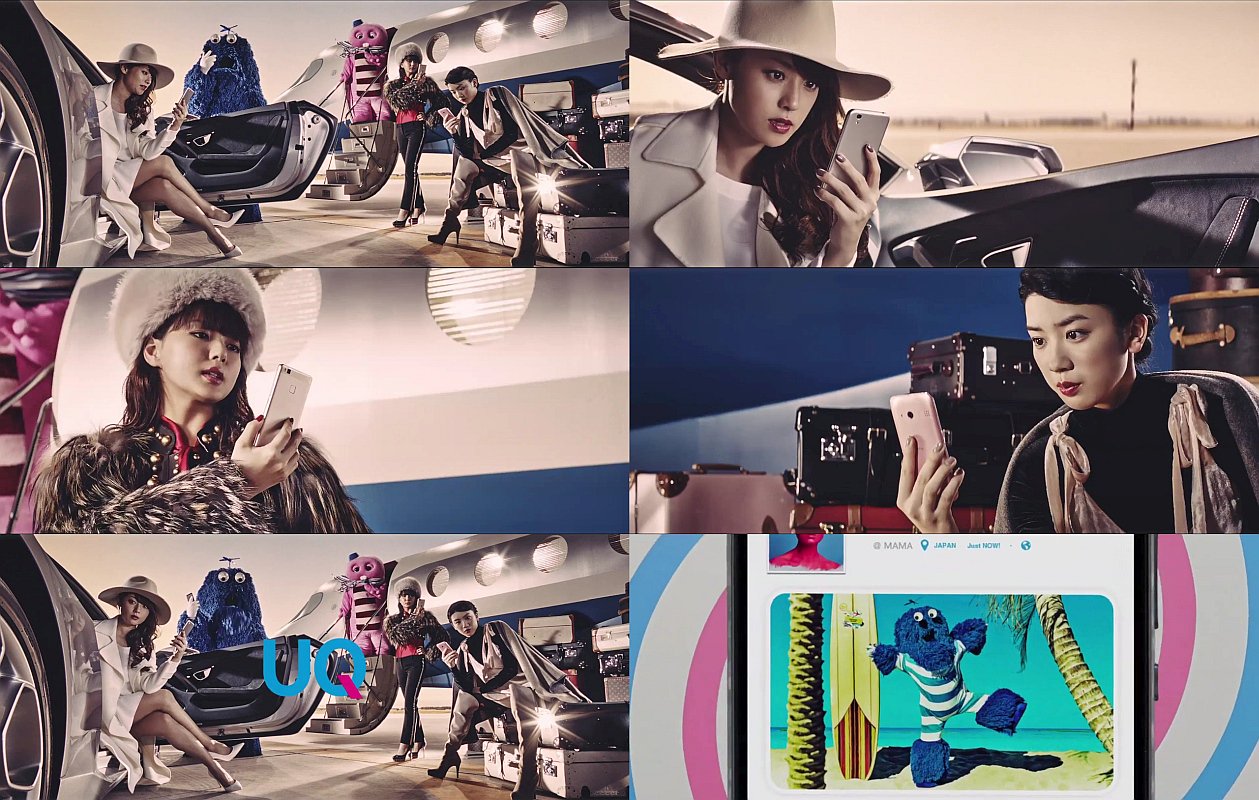 女優の深田恭子さん,永野芽郁さん,多部未華子さんが3姉妹役で出演するUQモバイルのCM。今回は、プライベートジェット?の飛行機を降りた後、家族旅行の思い出を語りながら、SNSへアップする写真を選びます。