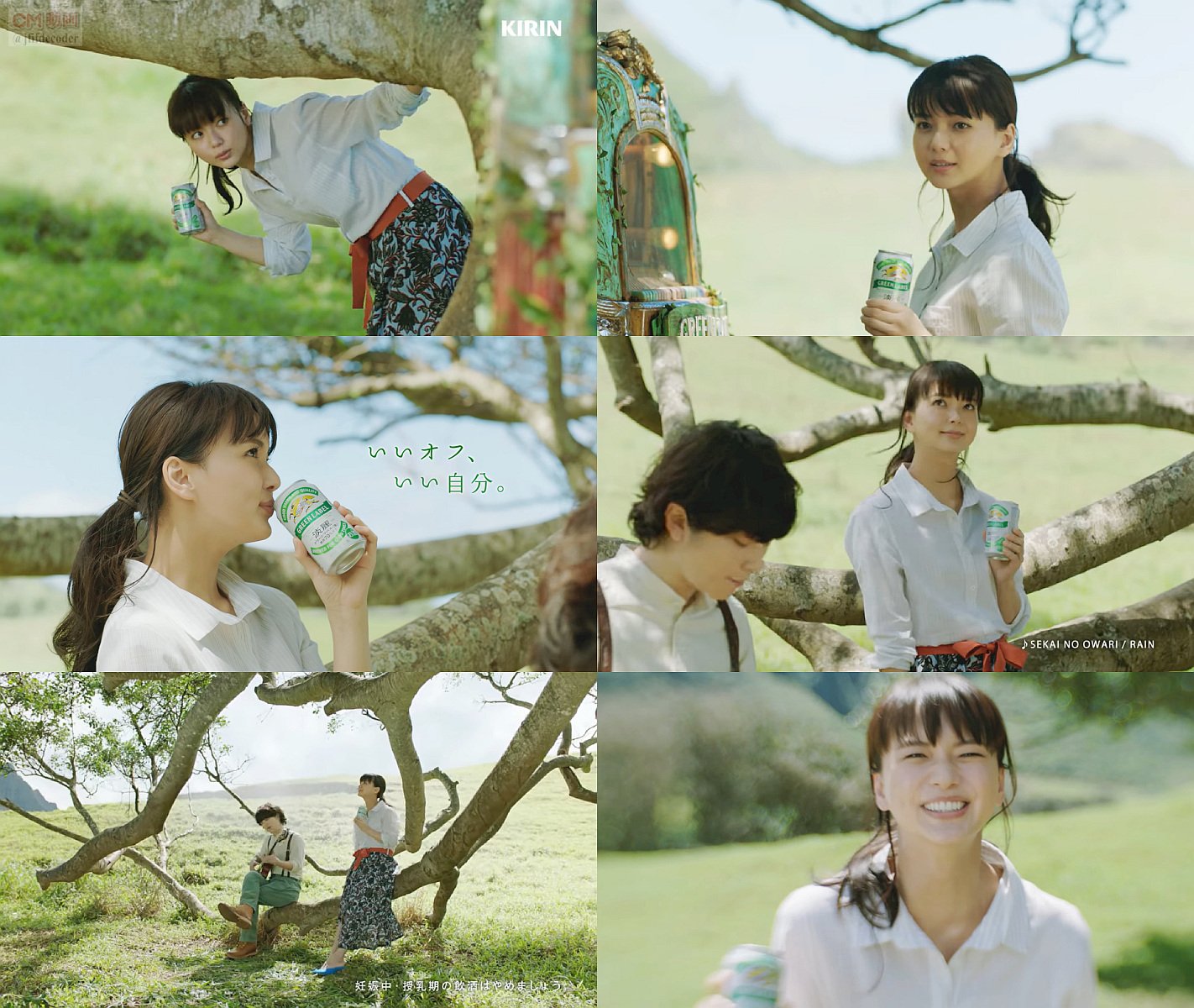 女優の多部未華子さんが、草原の木の下で「ある日不思議なジュークボックスに会った」と”雨”のレコードをかけると、突然雨が降り出して、SEKAI NO OWARIのFukaseさんが現れ、アコースティックギターを鳴らしながら、”RAIN”を歌い、多部未華子さんがキリン淡麗グリーンラベルを飲みながら「いいオフ、いい自分」と言う長編CM 分版です。
