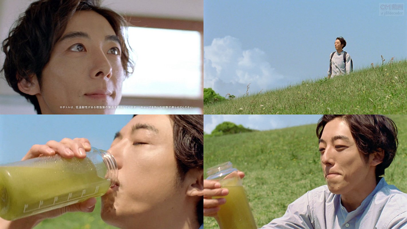 俳優の高橋一生さんが、生茶をボトルに入れて冷凍庫で生茶氷を作り、リュックに入れて初夏の散歩に出かけ「氷が解けると、まず成分が溶け出すらしい。どんな味だろう」と、徐々に溶けていく生茶の旨味や甘みを味わい少し微笑み「苦味を抑えた旨味、生茶」と言うCMです。