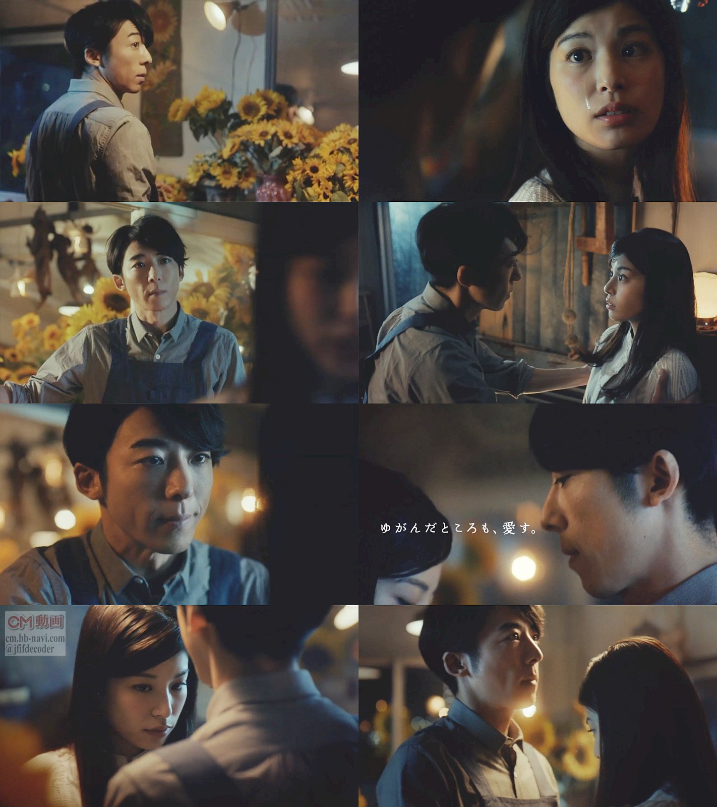 夜になって、さとうほなみさんが速足で花屋HIMAWARIに戻り、異変に気付いた高橋一生さんが見つめる中、「私、歪んでる?歪んでる、歪んでる」と言い、高橋一生さんが真面目な顔で「歪んでるんじゃないですか?人間て。僕だって…」と言って振り向いた頬に涙があったのを見て、腕をつかみ、しっかり目を見つめて「踊りませんか?」と二人でボサノバを踊り出すCM 30秒版です。