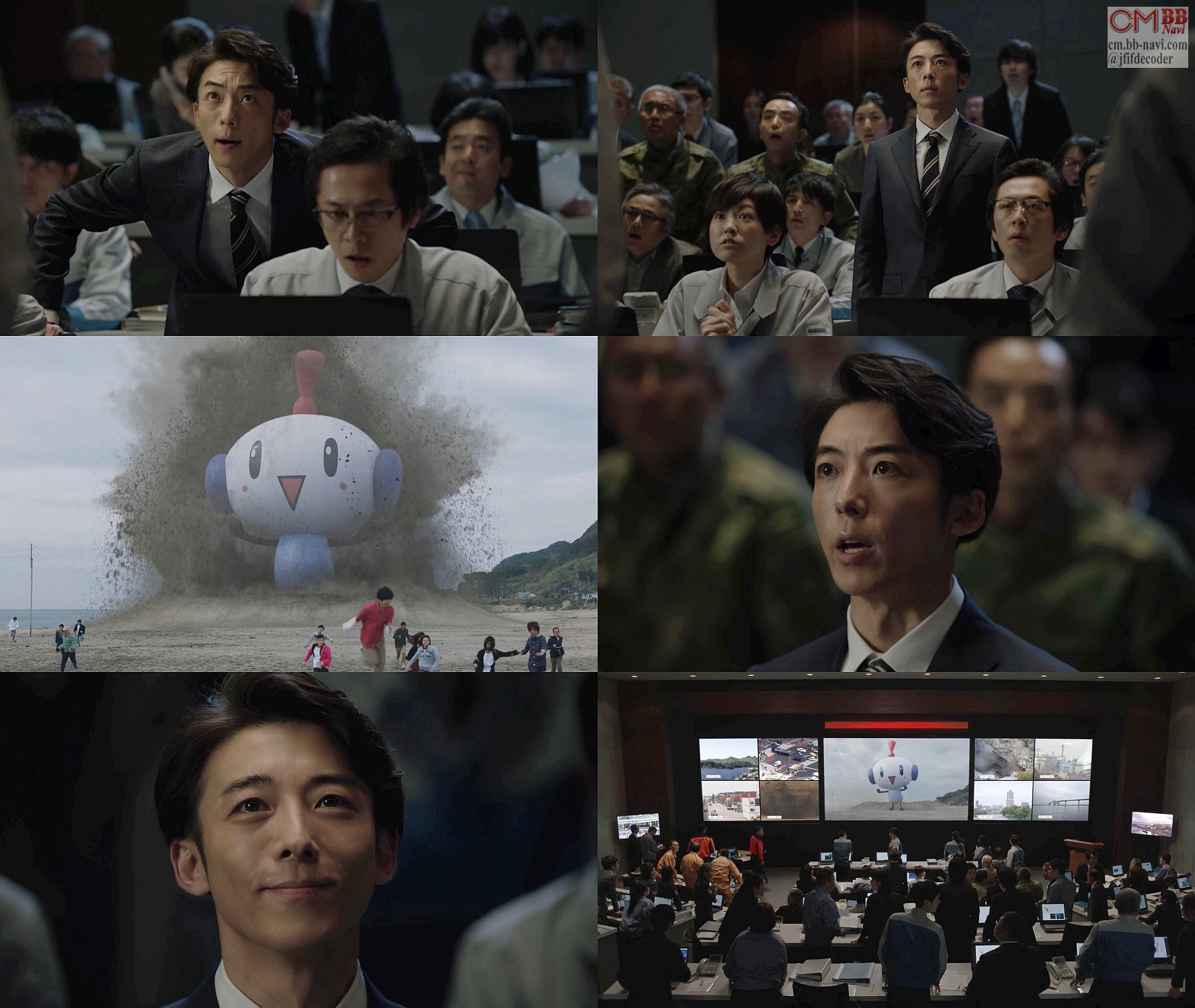 「巨大生物出現」と、スーツ姿の俳優の高橋一生さんが、巨大生物対策本部で、「映像は?」とモニターを見ると、土の中から巨大なAGCのキャラクターが現れ、女性スタッフが「旭硝子のキャラクター?」と聞くので、高橋一生さんが「違う。旭硝子あらためAGCだ」と言うと、巨大キャラクターAGCちゃんは”旭硝子はAGCへ”と告知する、AGCのCMです。