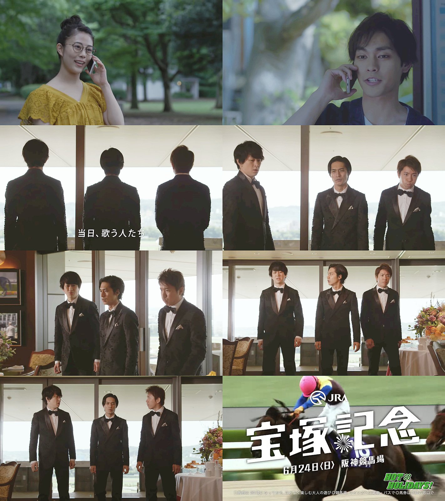俳優の柳楽優弥さんが宝塚に行く途中の駅で、公園を犬と散歩中の女優の高畑充希さんに「緊張してない?」と電話しながら、「だよね〜。でも、国歌歌う人とかすっごく緊張するだろうね」「誰が歌うんだろ」と会話してるその頃、競馬場では正装した関ジャニ∞の横山裕,村上信五,錦戸亮の3人が、大勢の観客を見て「アカン、めっちゃ人おる」「俺待っとくわ」「いや、あかんやろ」「どうないしよ…」「歌われへんて…」と関西弁で会話しているCM 30秒版です。