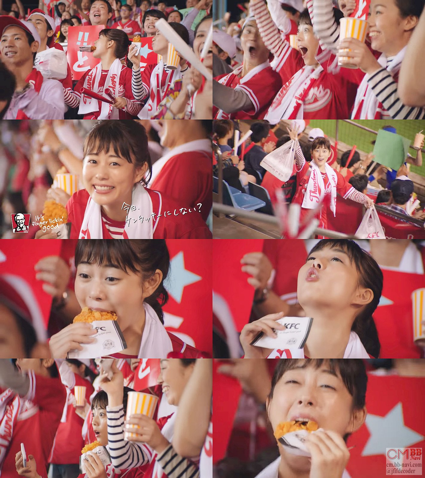 女優の高畑充希さんが、野球の応援に遅れてやって来て「片手でお手軽、ザクザク骨無しケンタッキー」と骨なしケンタッキーを食べながら応援する、ケンタッキーのCM。