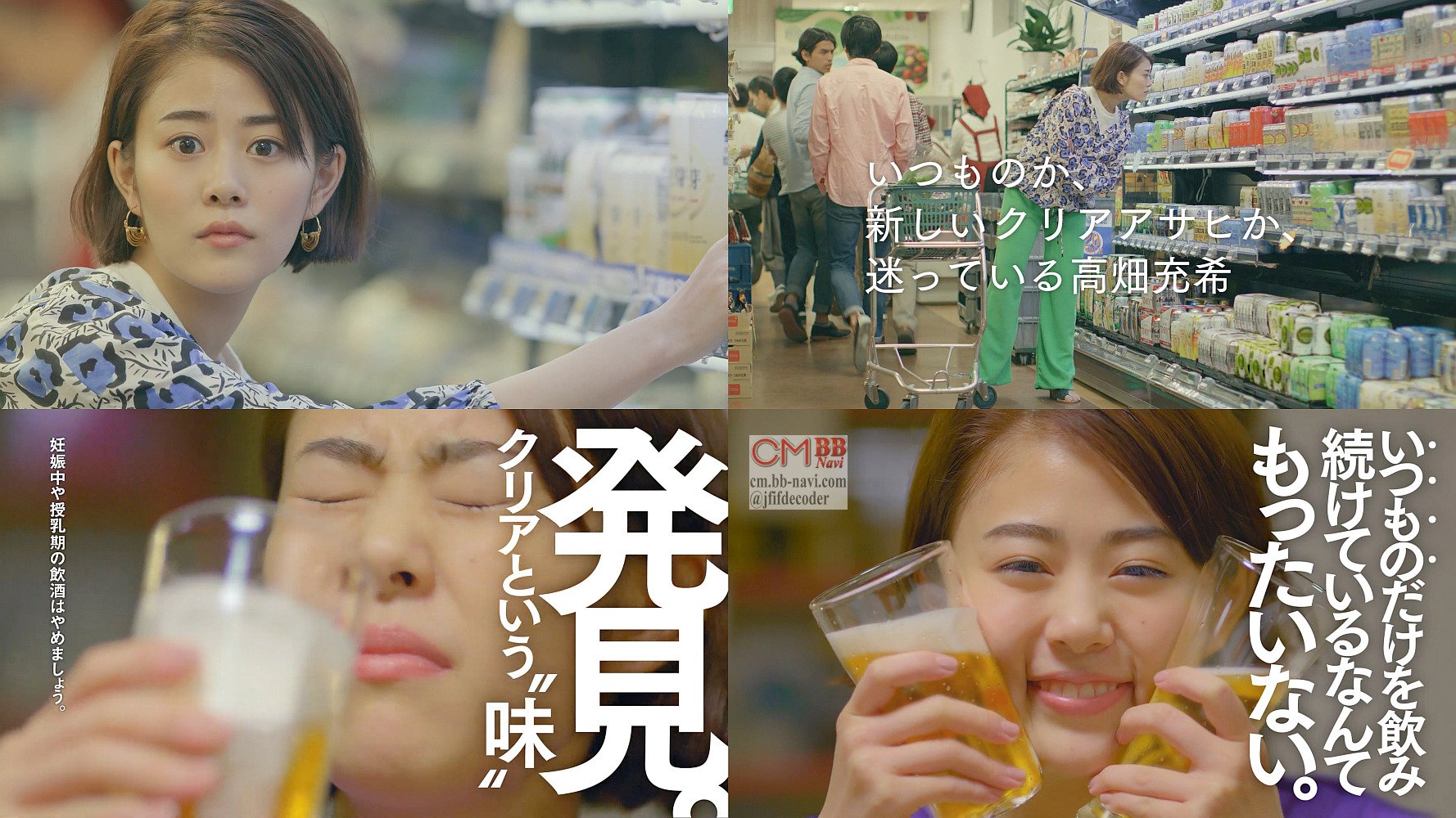 女優の高畑充希さんがスーパーで「飲み比べしよう♪飲み比べしよう♪」のCM曲で「とりあえず買ってみます」と、自宅でグラスに注いだクリアアサヒといつものとを飲み比べして「いつものと、比べてみない?」と言う、クリアアサヒのCMです。