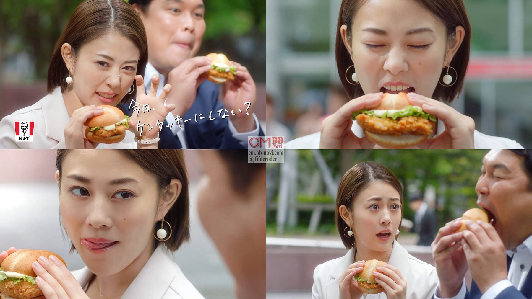 高畑充希さんが男性と公園のベンチで「チキンフィレにかぶりつくって野生って感じですよね」とライオンが吠えるようにチキンフィレサンドを食べる、ケンタッキーのCM。