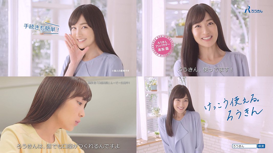 ロングヘアーの髪型の女優の高梨臨さんが「私は、ろうきん使ってます」と登場し、ATM手数料無料を紹介した後、「けっこう、使える ろうきん」と言うCM動画です。