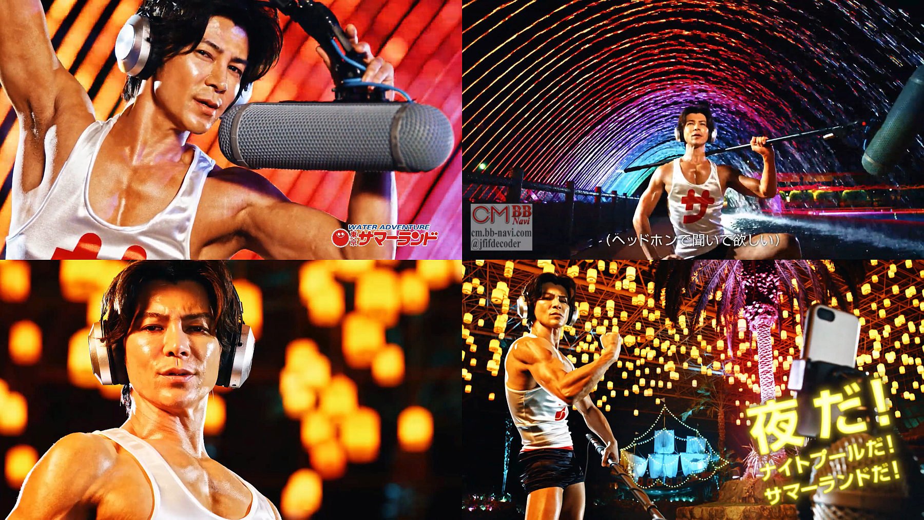 集音マイクにヘッドフォンに”サ”のTシャツに短パン姿の俳優の武田真治さんが「ナイトプールの音、聞いてください」と東京サマーランドの夜のナイトプールに登場し、「自撮りしたくなっちゃうよね」と筋肉を見せるようにポージングする、東京サマーランドのCMです。