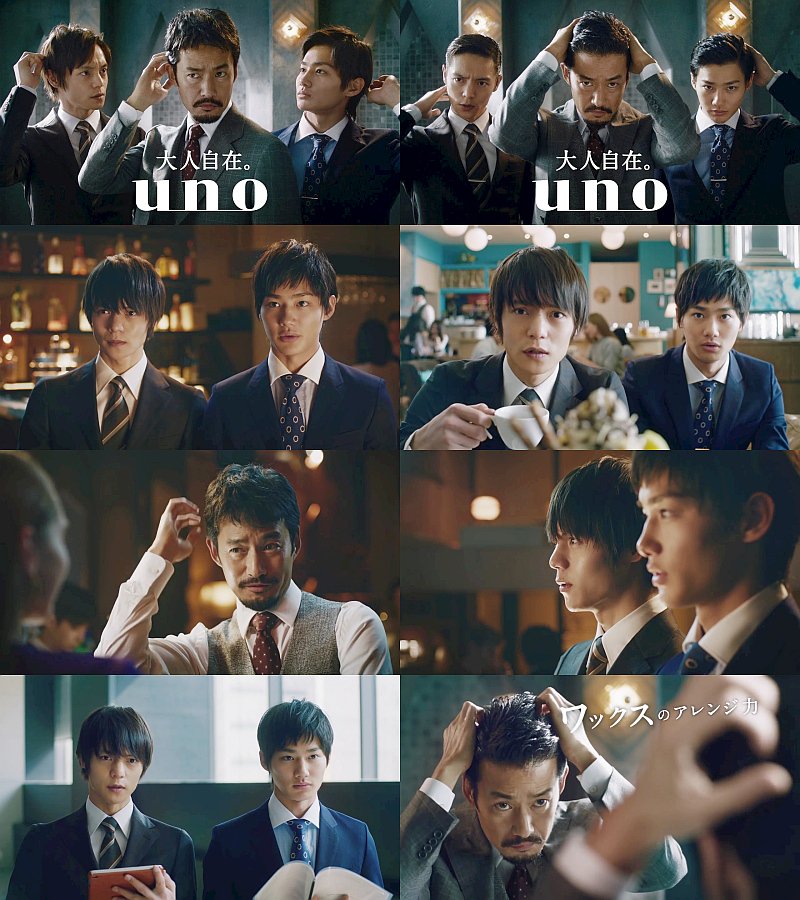 ビシッとキメてきた先輩役の俳優の竹野内豊さんを、後輩役の窪田正孝さんと野村周平さんが、プレゼンで「勝負の時は」「キメちゃウーノ」、バーで「楽しむ時は」「崩しちゃウーノ」、女性を口説きながら「男の俺でも」「惚れちゃウーノ」と言い、3人揃って竹野内豊さんの真似をしながら「真似」「しちゃウーノ」と言う、ウーノのCM動画です。